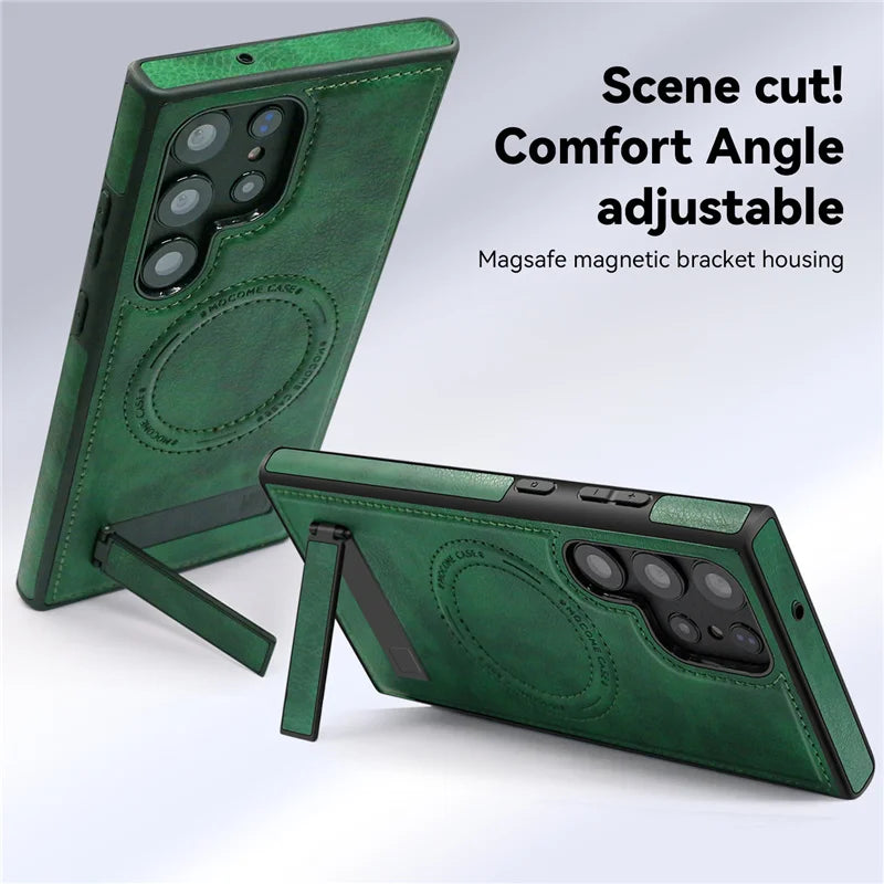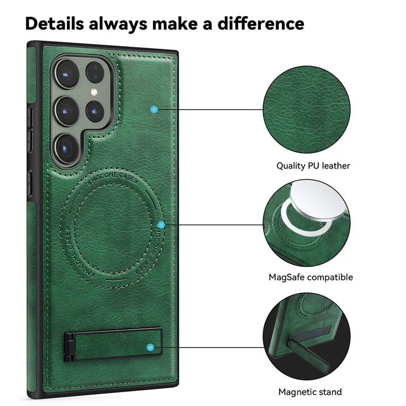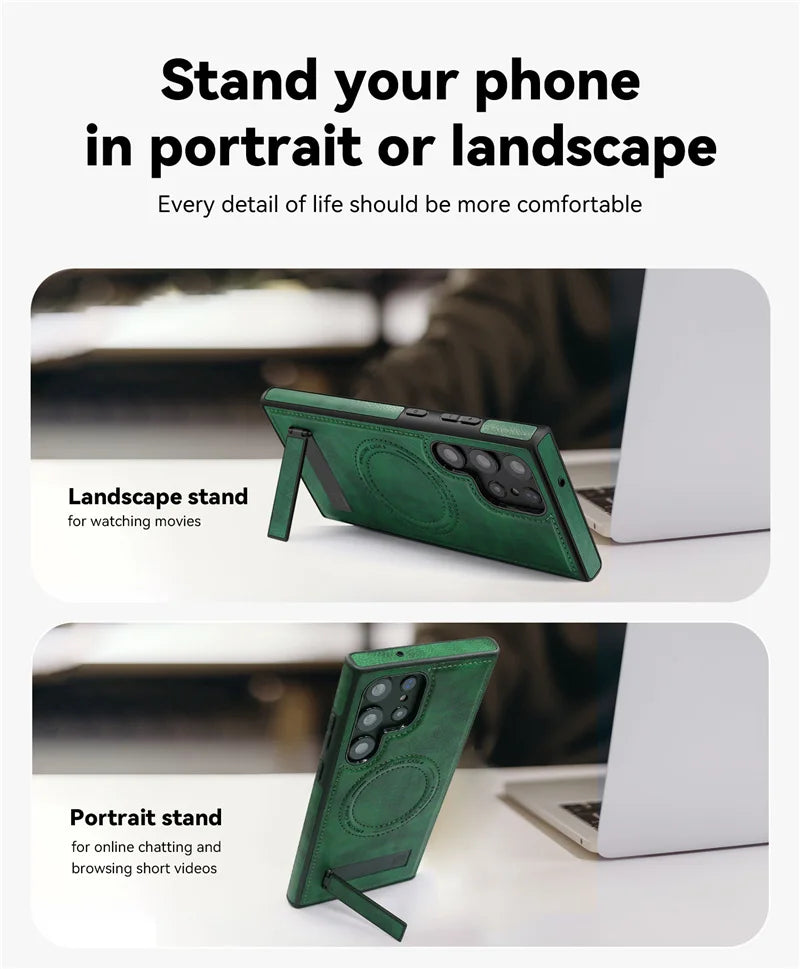 Protect and elevate your Samsung Galaxy with a slim, MagSafe-compatible leather case featuring a sturdy fold-out kickstand for hands-free viewing. The smooth vegan leather adds a refined grip, raised edges shield the screen and lenses, and a shock-absorbing bumper softens everyday drops—while the built-in magnetic ring locks onto chargers and mounts without wobble.