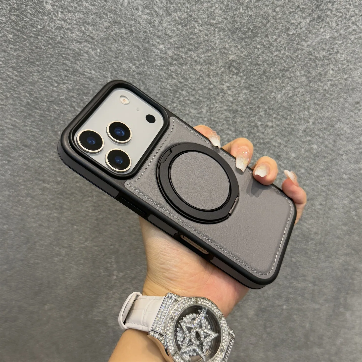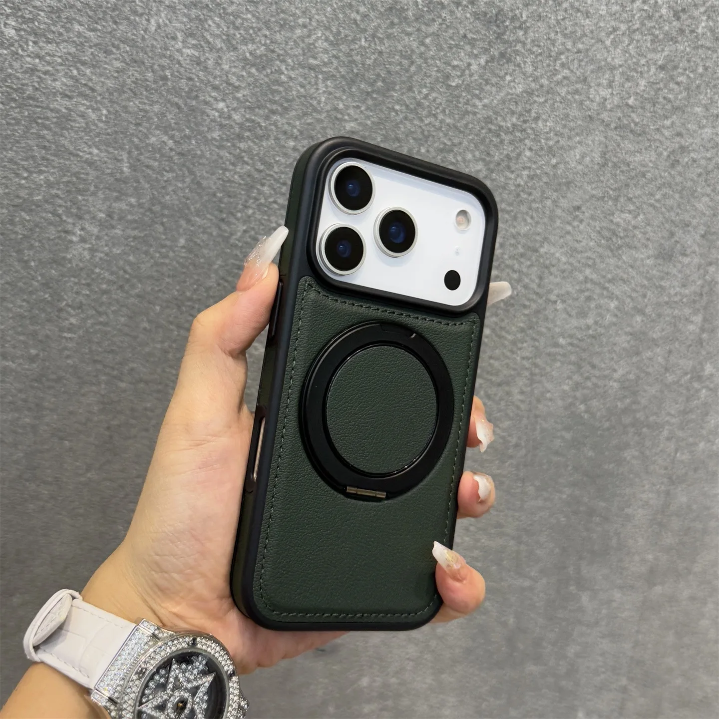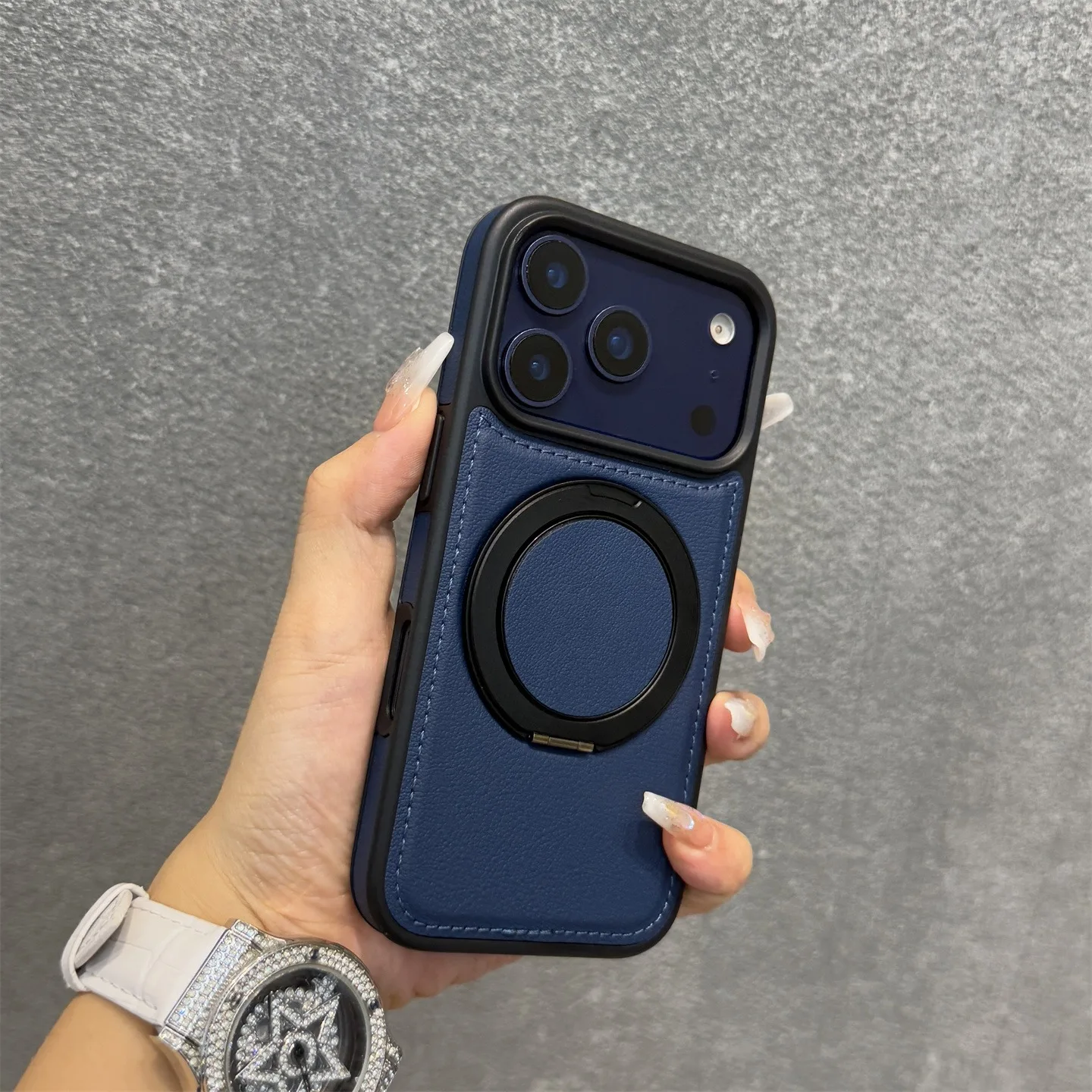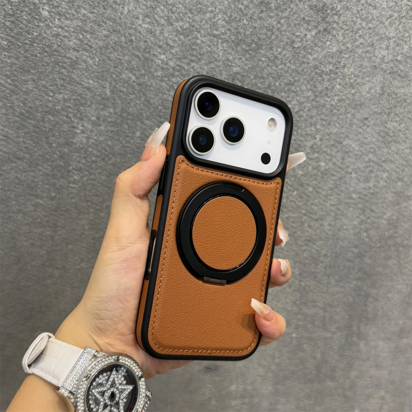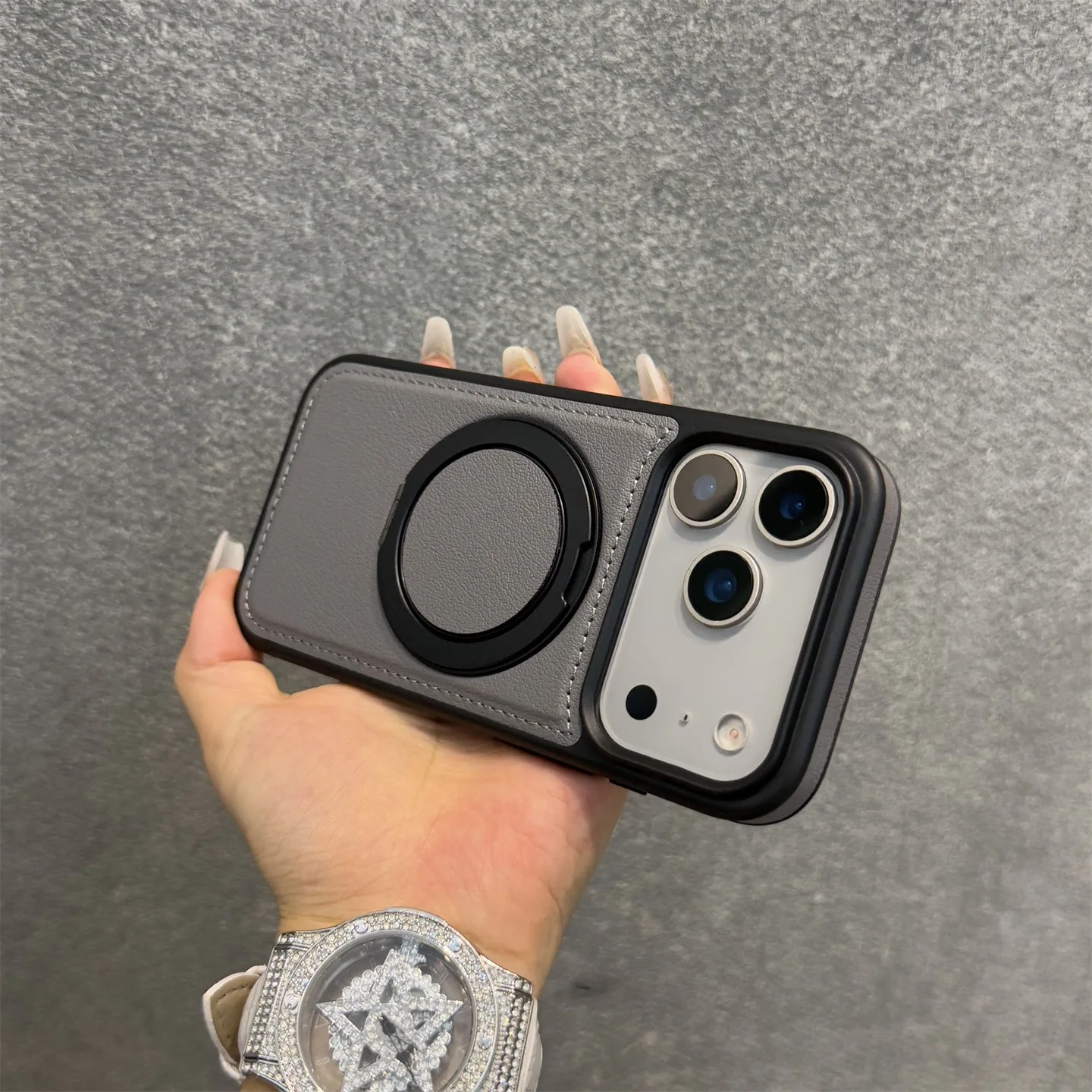 Dress your iPhone in premium PU leather with a 360° rotating ring that works as a secure grip and stable kickstand—without blocking MagSafe. The slim shock-absorbing bumper, raised bezels, and soft microfiber lining protect against scratches and daily drops, while precise cutouts keep every tap and click effortless.
