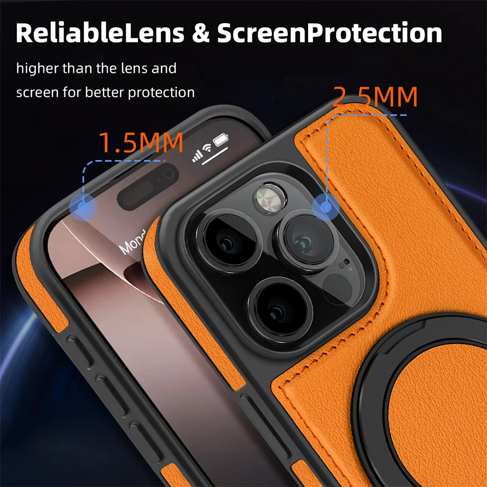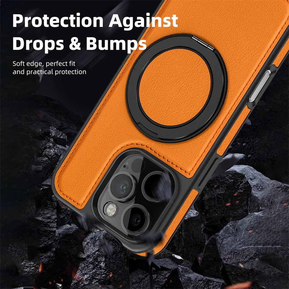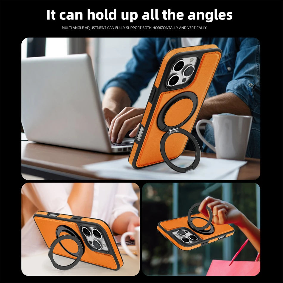 Get everyday luxury with practical power: premium leather feel, reliable MagSafe strength, a versatile 360° ring stand, and real protection—slim enough for daily carry yet tough where it counts.