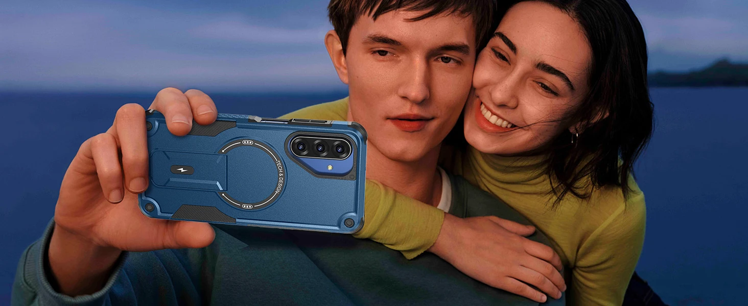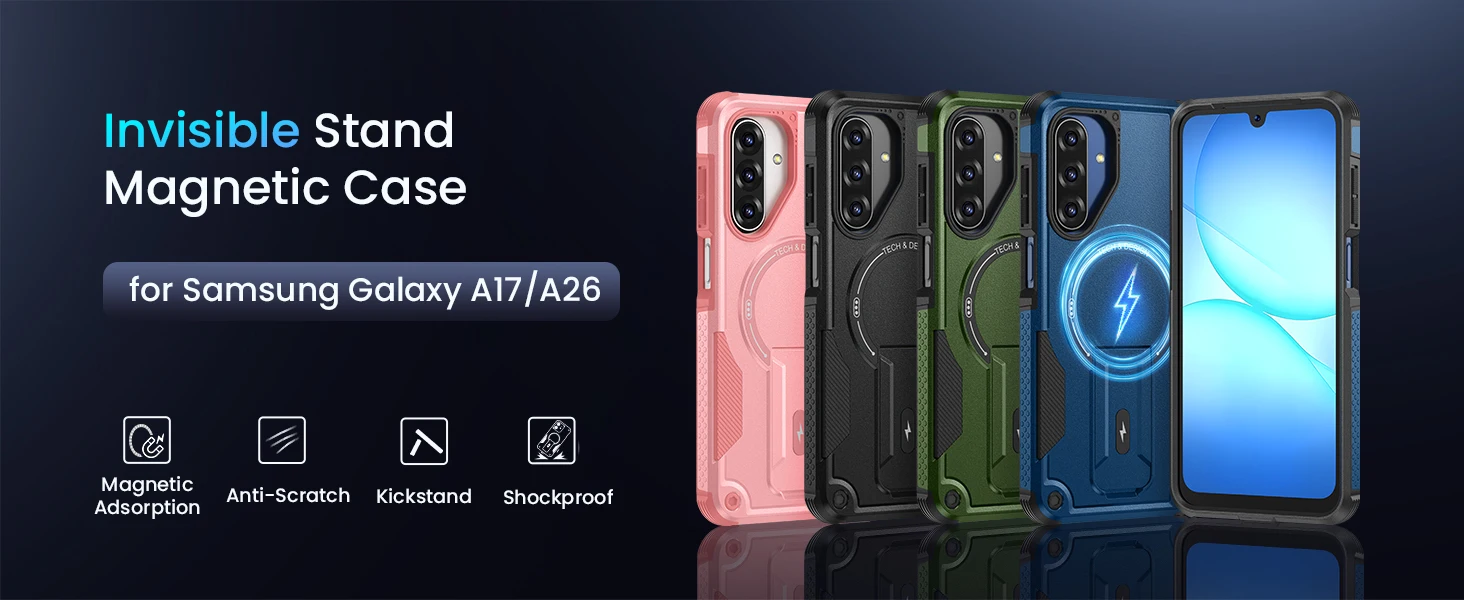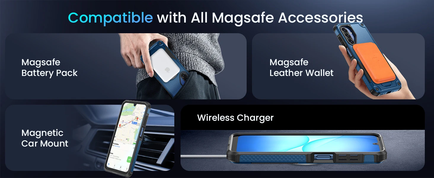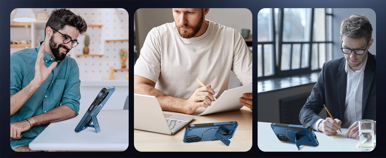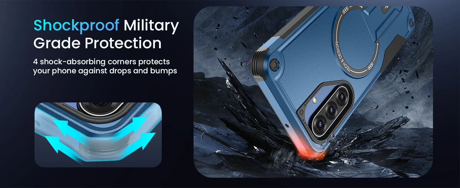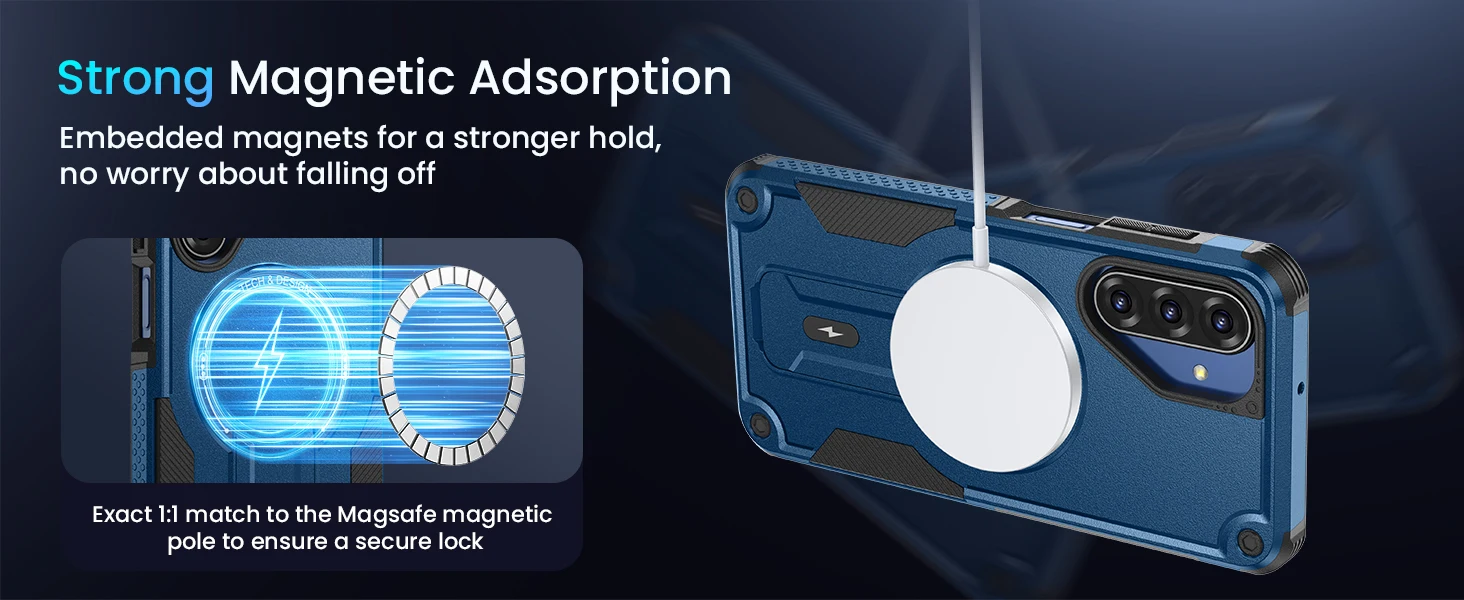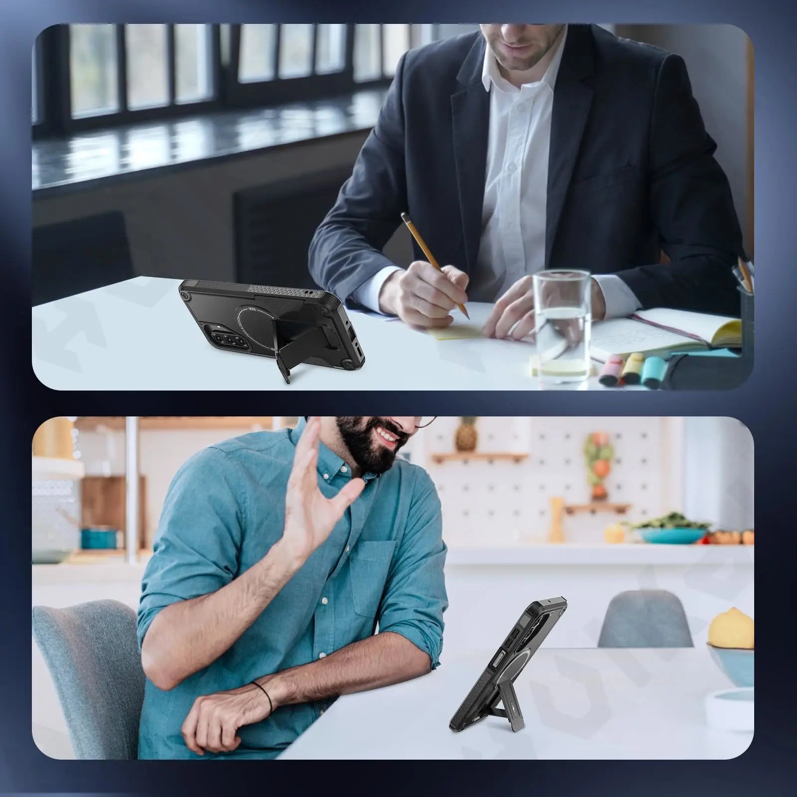 Built for daily impact, this slim rugged case adds a precise magnetic ring for MagSafe-compatible chargers and mounts, while the metal kickstand snaps open for stable portrait or landscape viewing. Grippy edges, raised bezels, and shock-absorbing corners keep your Galaxy safer without bulky weight.